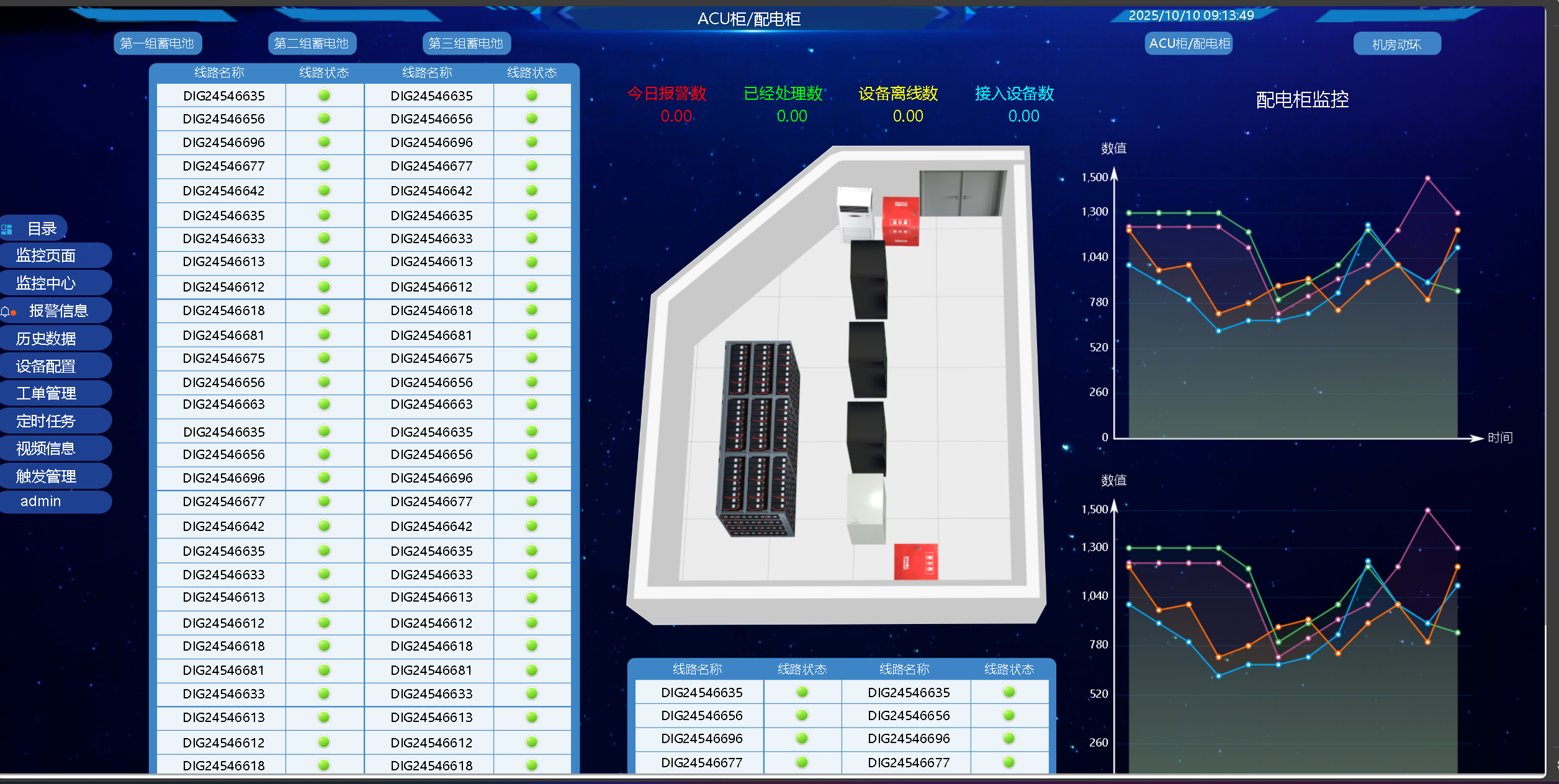 配電柜監控: 3套配電柜的市電狀態、主要開關狀態、電壓、電流等共數十路回路參數。